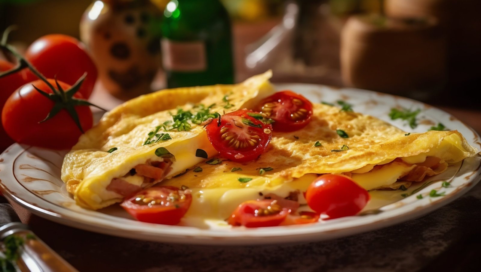 Aqueça uma frigideira antiaderente em fogo médio. Adicione um fio de azeite e despeje a mistura dos ovos. Cozinhe até que a parte de baixo esteja dourada e firme. Com o auxílio de uma espátula, dobre a omelete ao meio e cozinhe por mais alguns segundos.